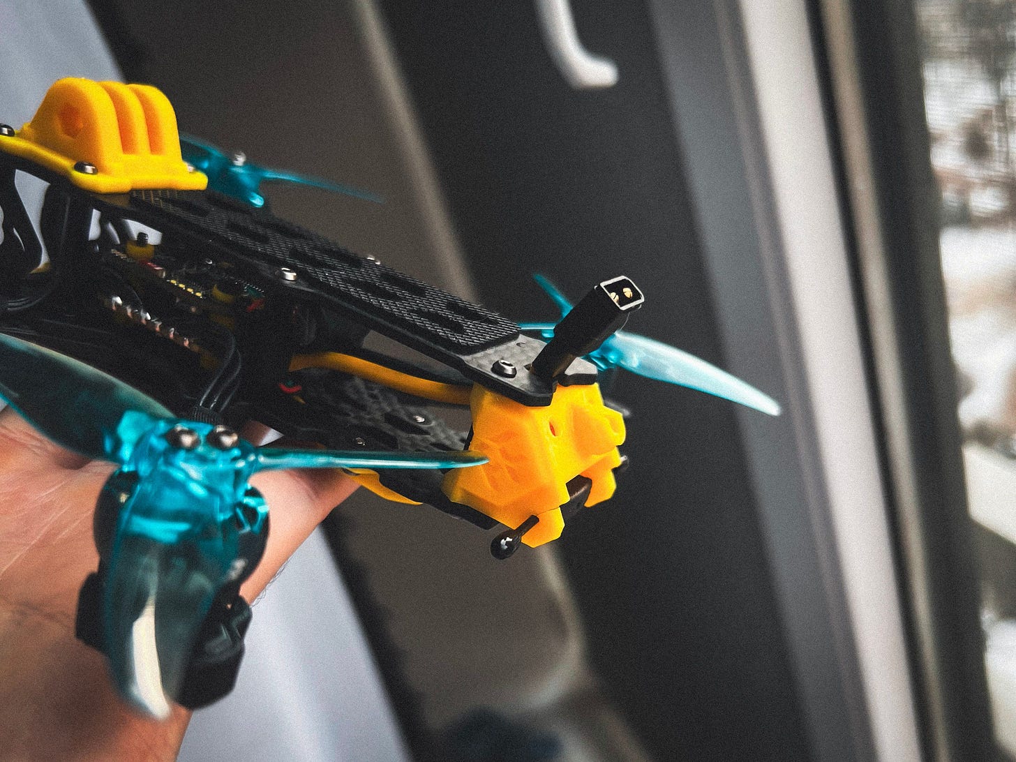 У будь-якому випадку, я дуже рекомендую додати трохи віброізоляції, щоб не пошкодити внутрішні компоненти відеопередавача. Ось такі проставки з 3D-друку або навіть звичайні гумові шайби гарно справляються з цим завданням.