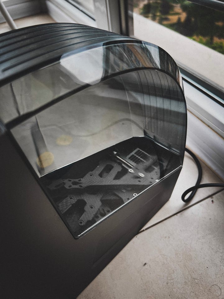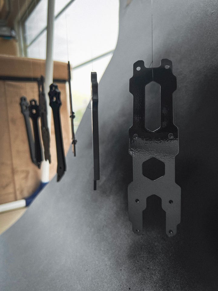 Я, звісно, підготувався і мав чорну фарбу. Але невеликий тест цієї фарби на рамці AlfaRC показав, що в мене немає достатньо хороших умов, щоб правильно її нанести — з’являлася легка текстура, а я хотів отримати гладку чорну поверхню.