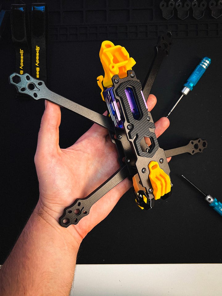 Для цього білду я обрав свій улюблений SpeedyBee F405 V4 стек та SpeedyBee Nano RX. Надійна, чиста і візуально приємна комбінація, яка ідеально вписується у цей фрейм.