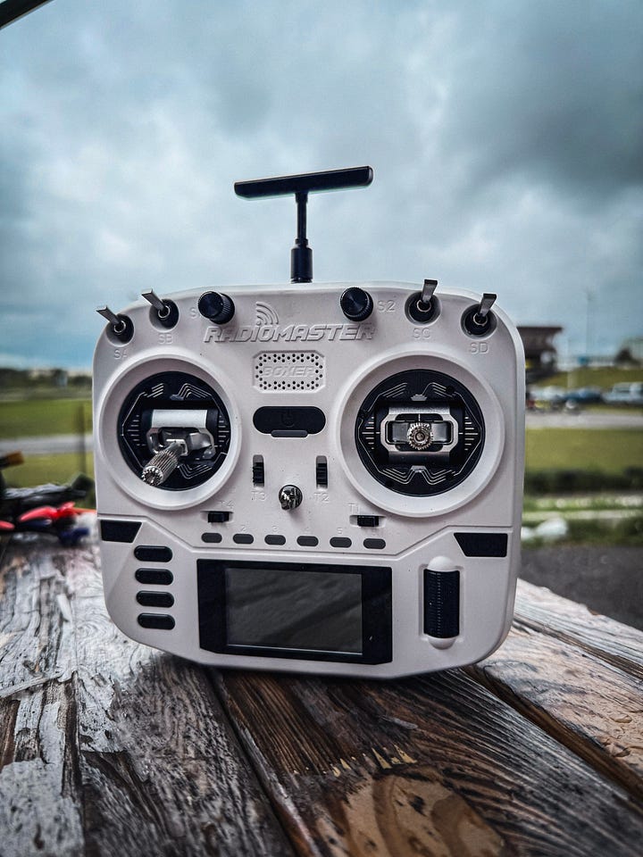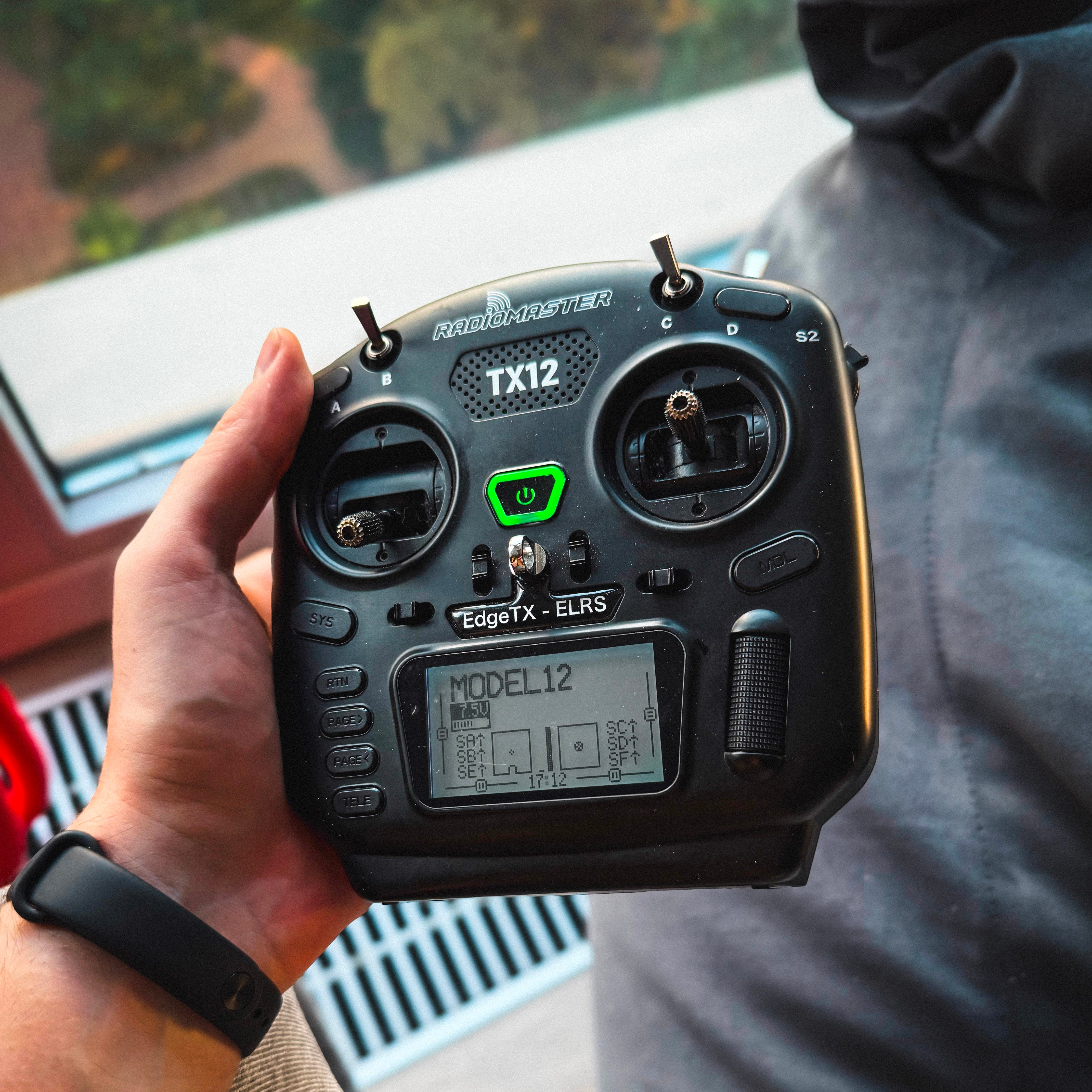 RadioMaster TX12 — це базована апаратура. Якщо ви будете проходити будь-який FPV-курс, то з високою ймовірністю побачите там цей пульт. Він зручний для людей із будь-яким розміром долонь, має всі необхідні функції, достатню кількість тумблерів, комфортний хід стіків та можливість підключення зовнішнього TX модуля.